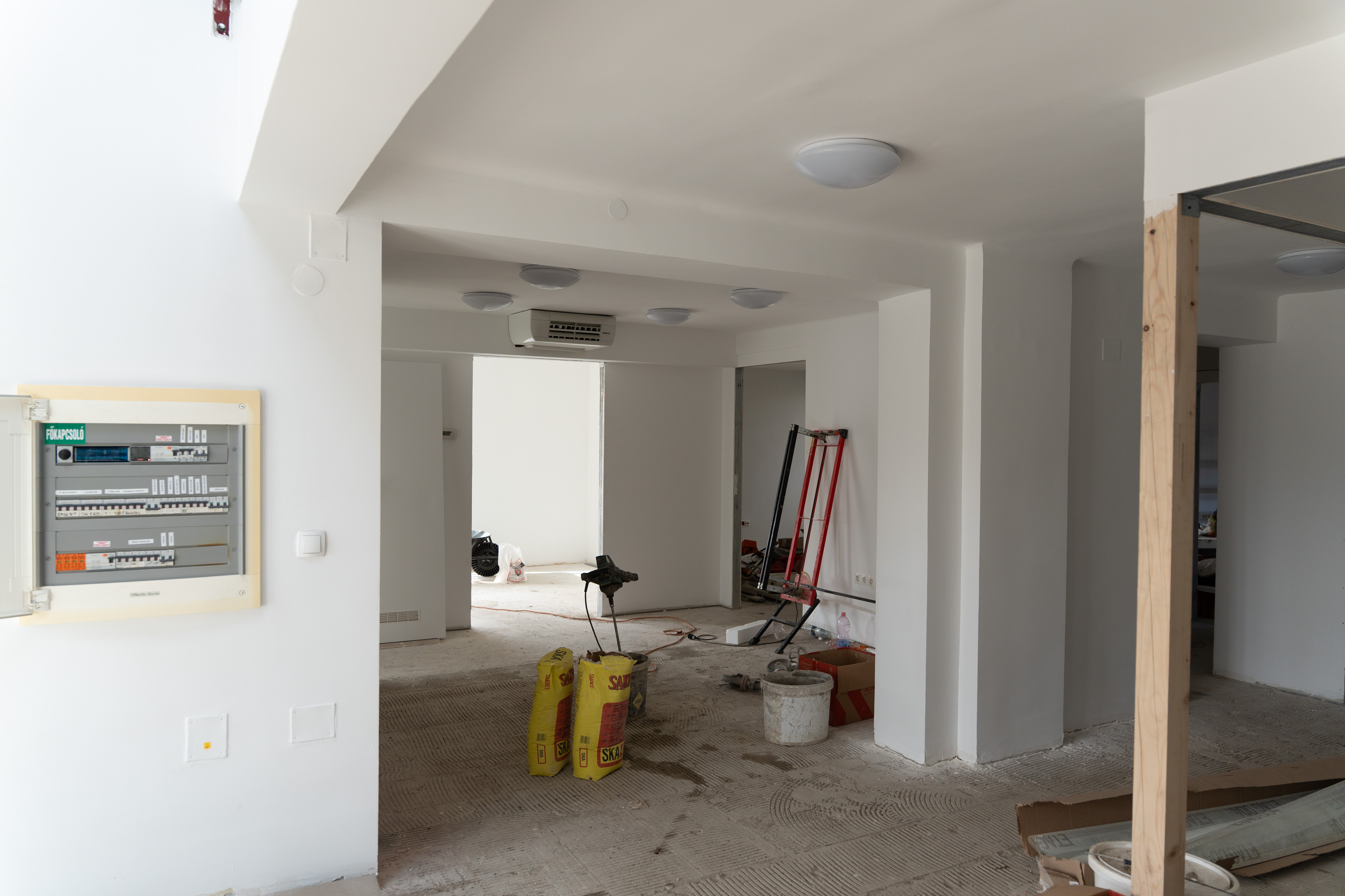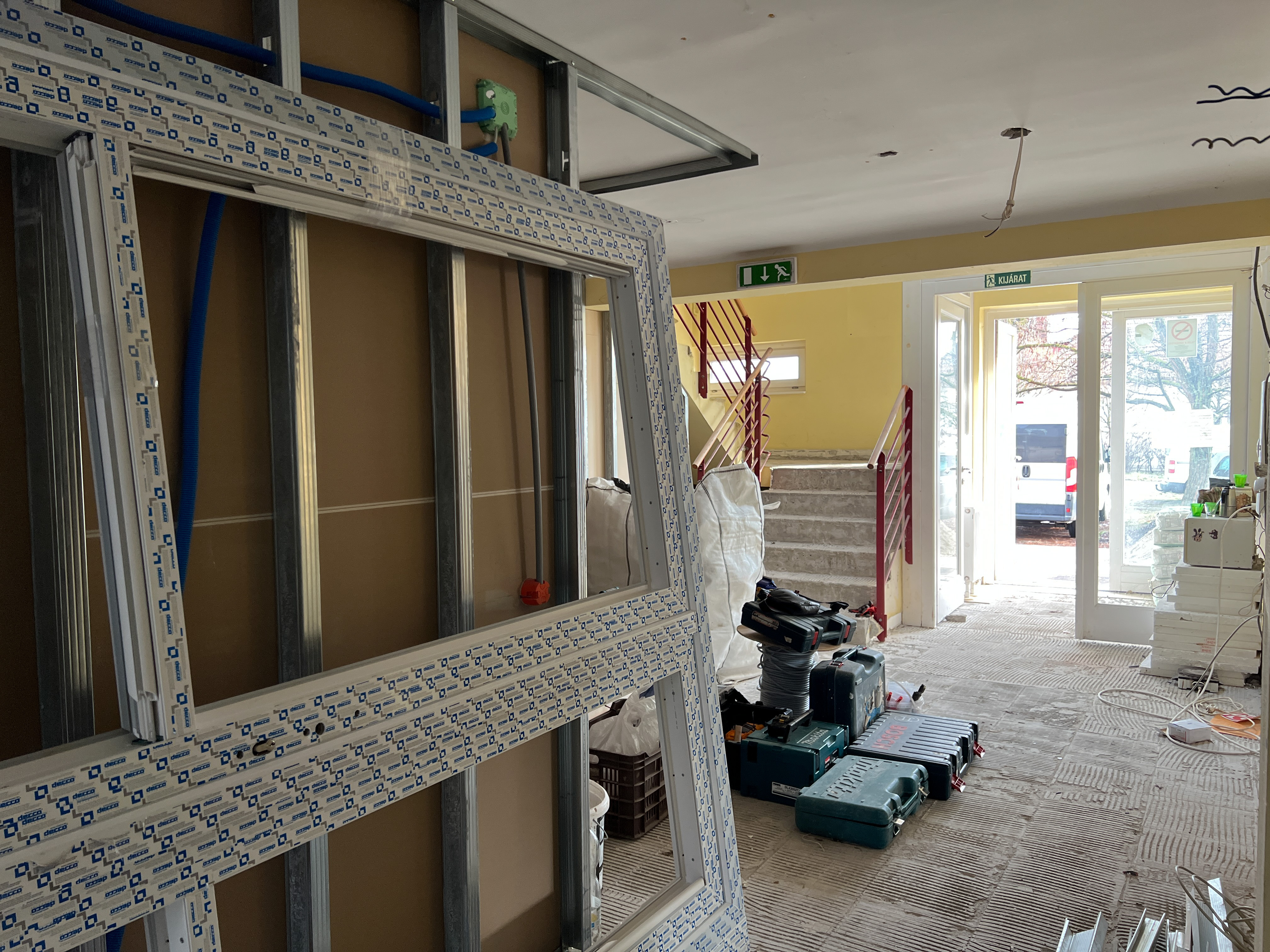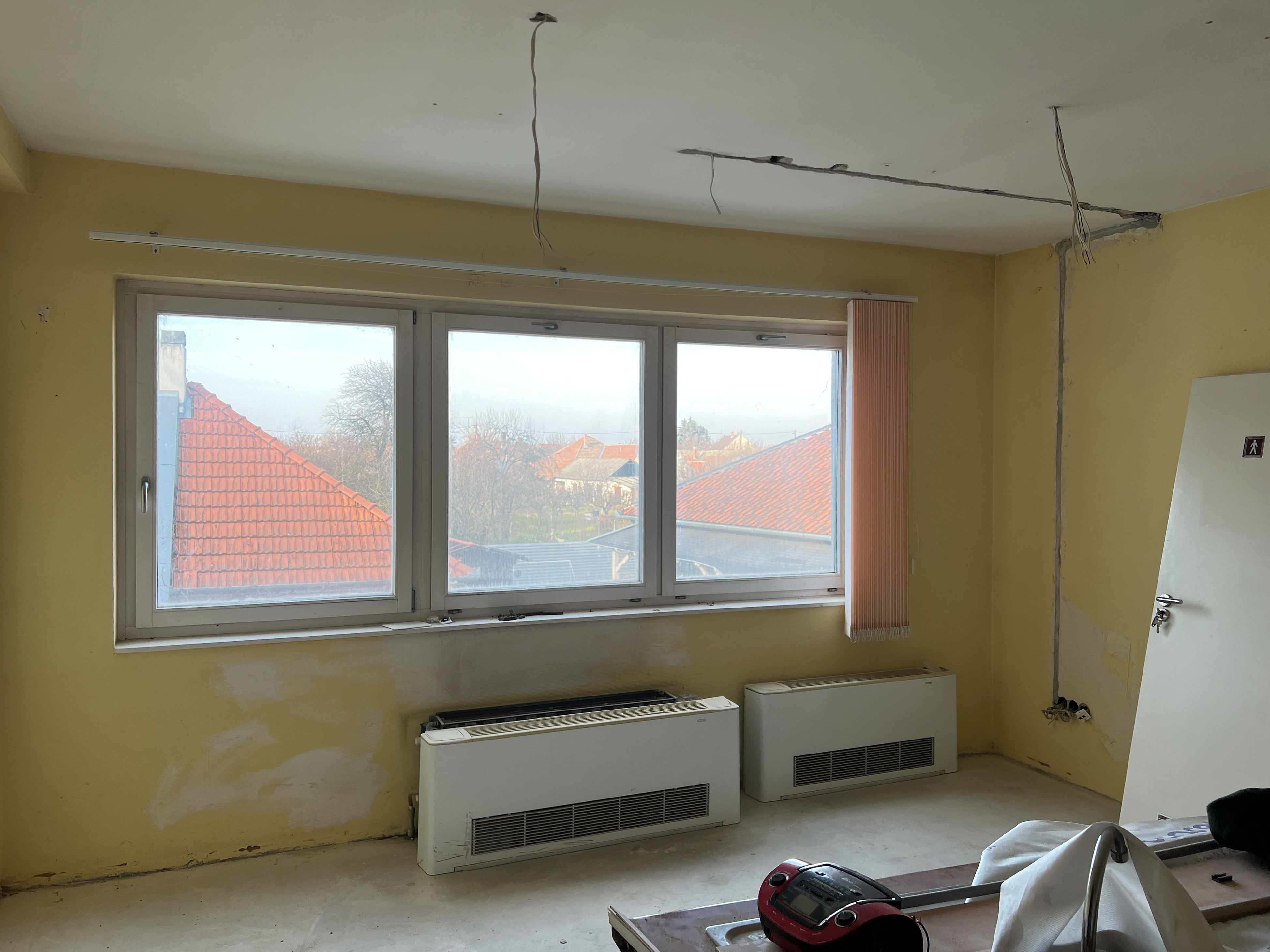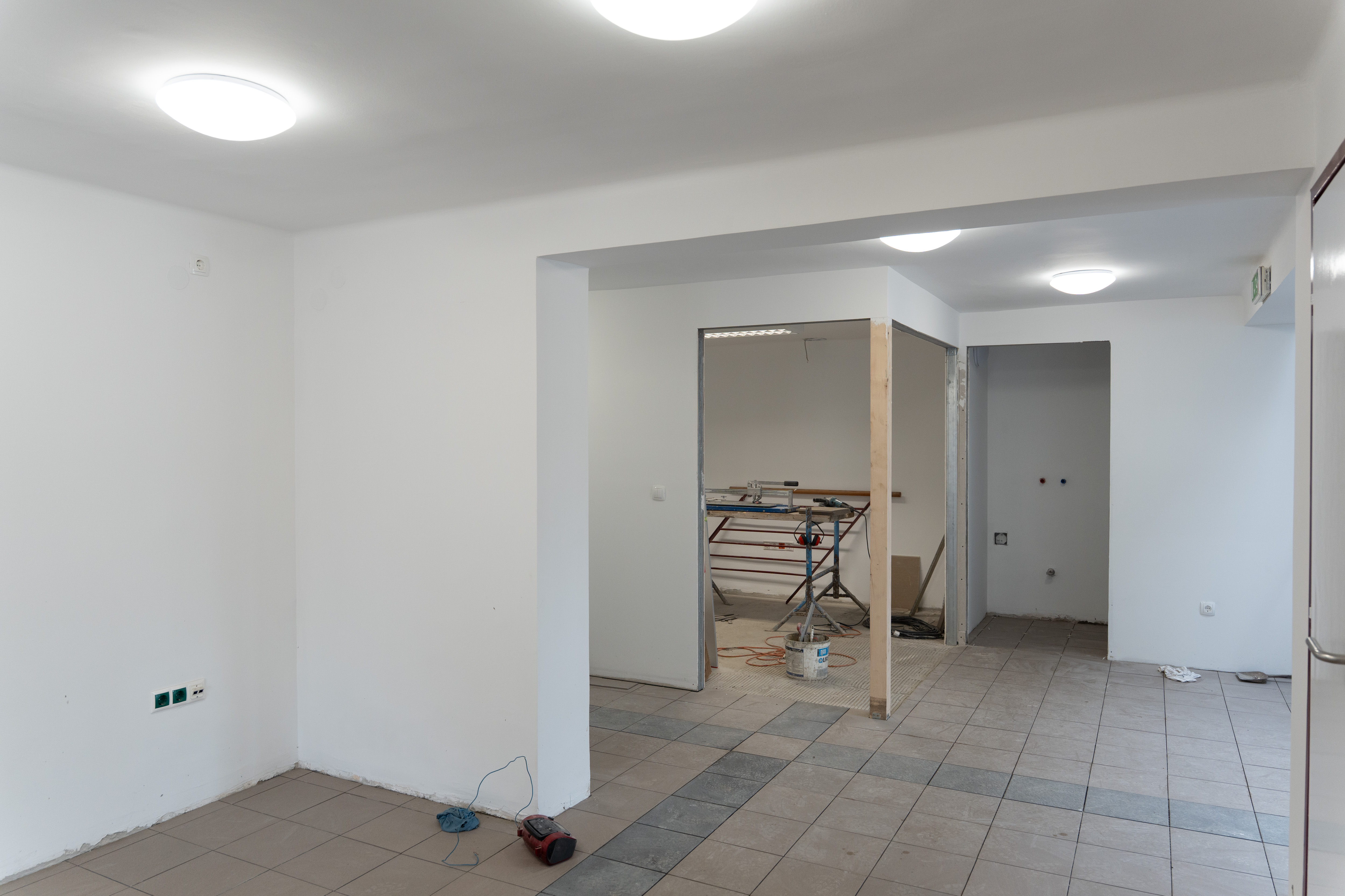 • A meglévő épület belső, alaprajzi átalakítása, új irodahelyiségek, tárgyaló és egyéb új helyiségek, takarítószertároló kialakítása (meglévő belső válaszfalak, ajtók bontása, új válaszfalak, ajtók beépítése).