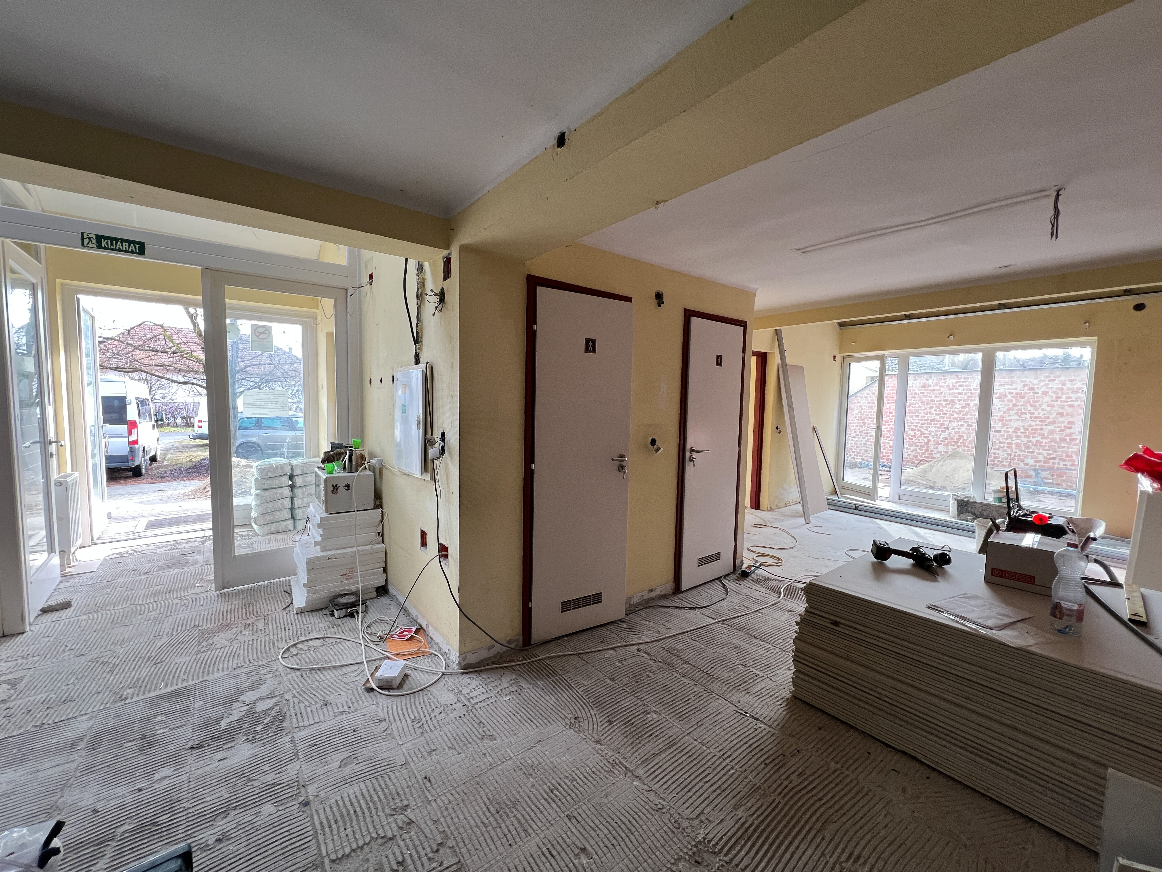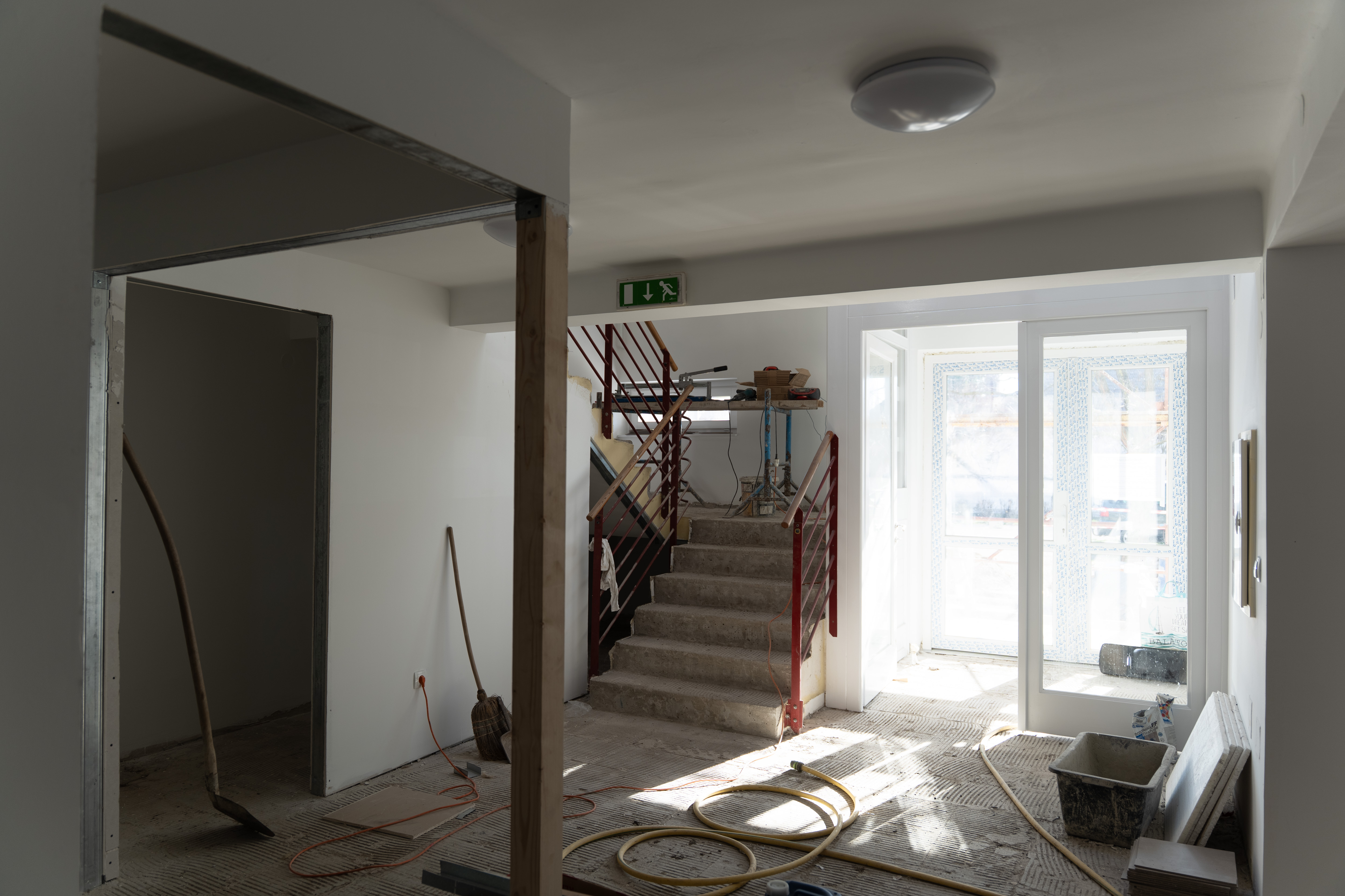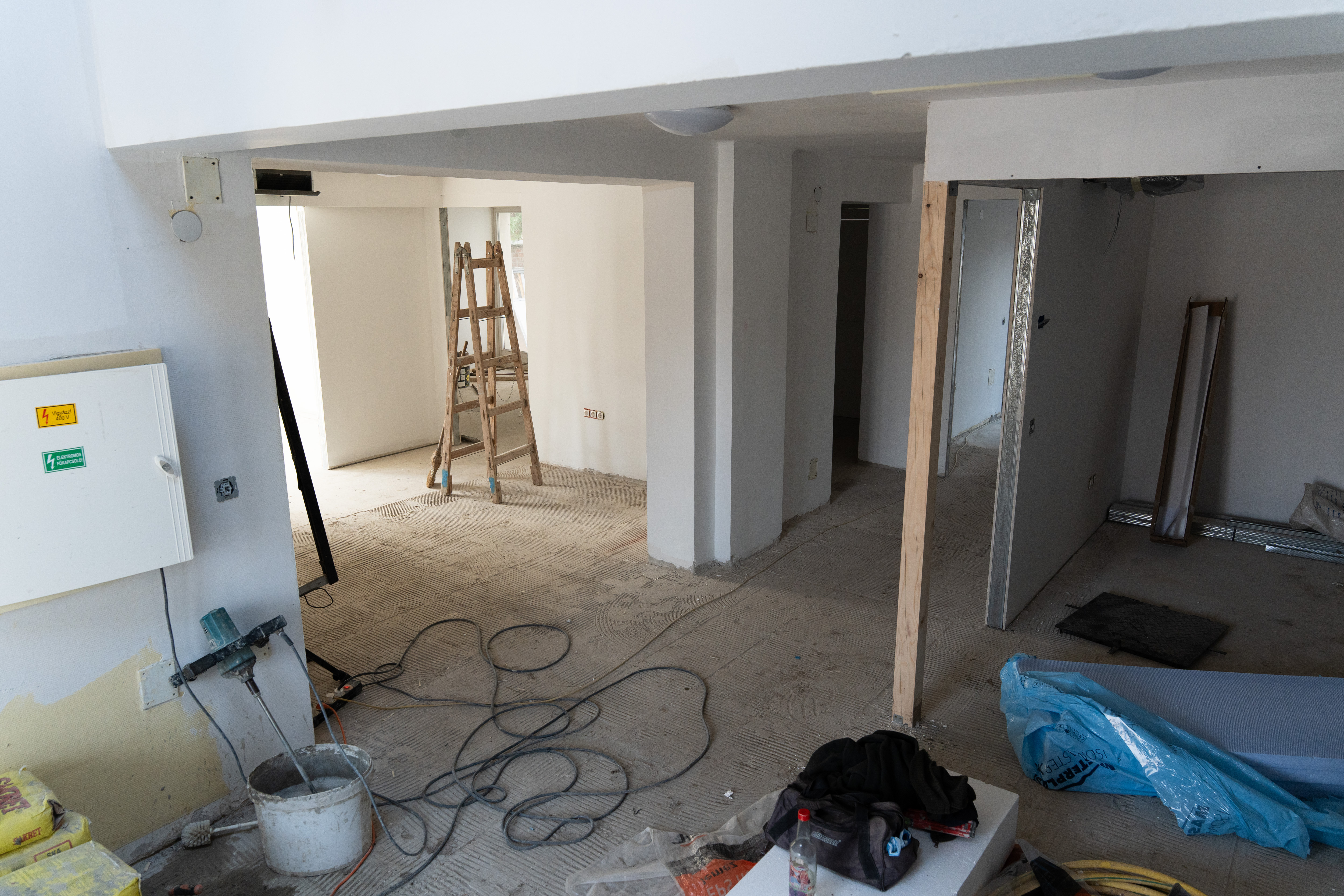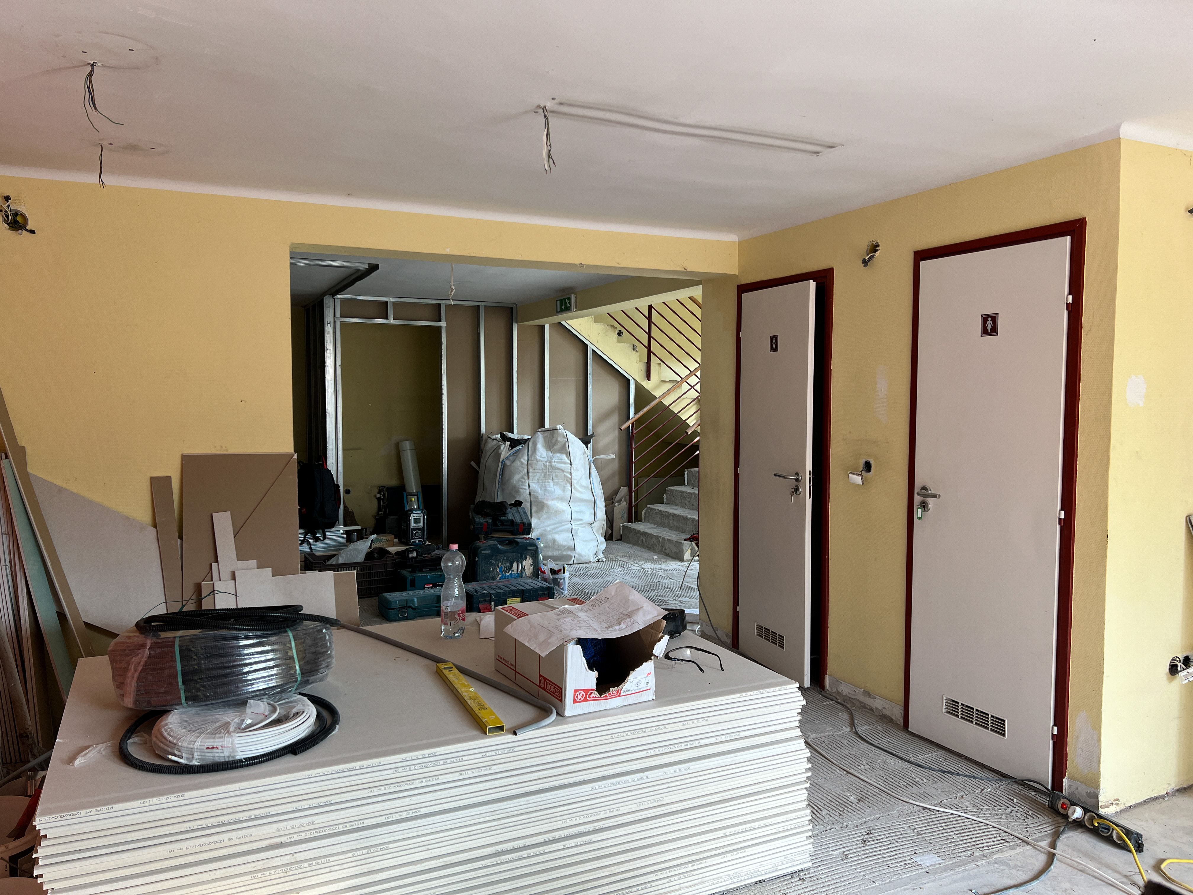 • A meglévő épület belső, alaprajzi átalakítása, új irodahelyiségek, tárgyaló és egyéb új helyiségek, takarítószertároló kialakítása (meglévő belső válaszfalak, ajtók bontása, új válaszfalak, ajtók beépítése).